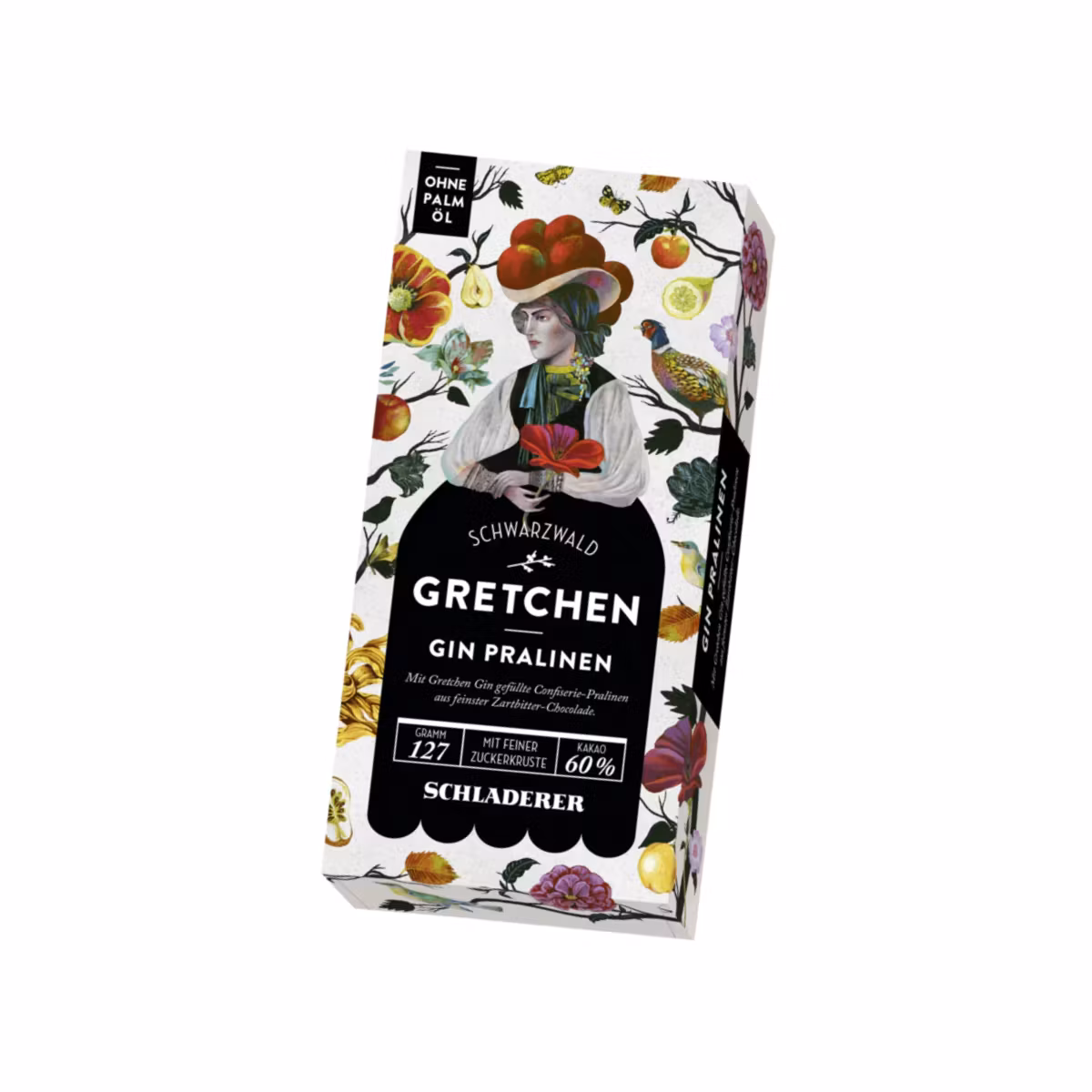 Schladerers Gretchen Gin är en pralin som har ett mörkt chokladtäcke, med minst 60 % kakaoinnehåll, en fin botten och som är fyllda med Gretchen Gin.